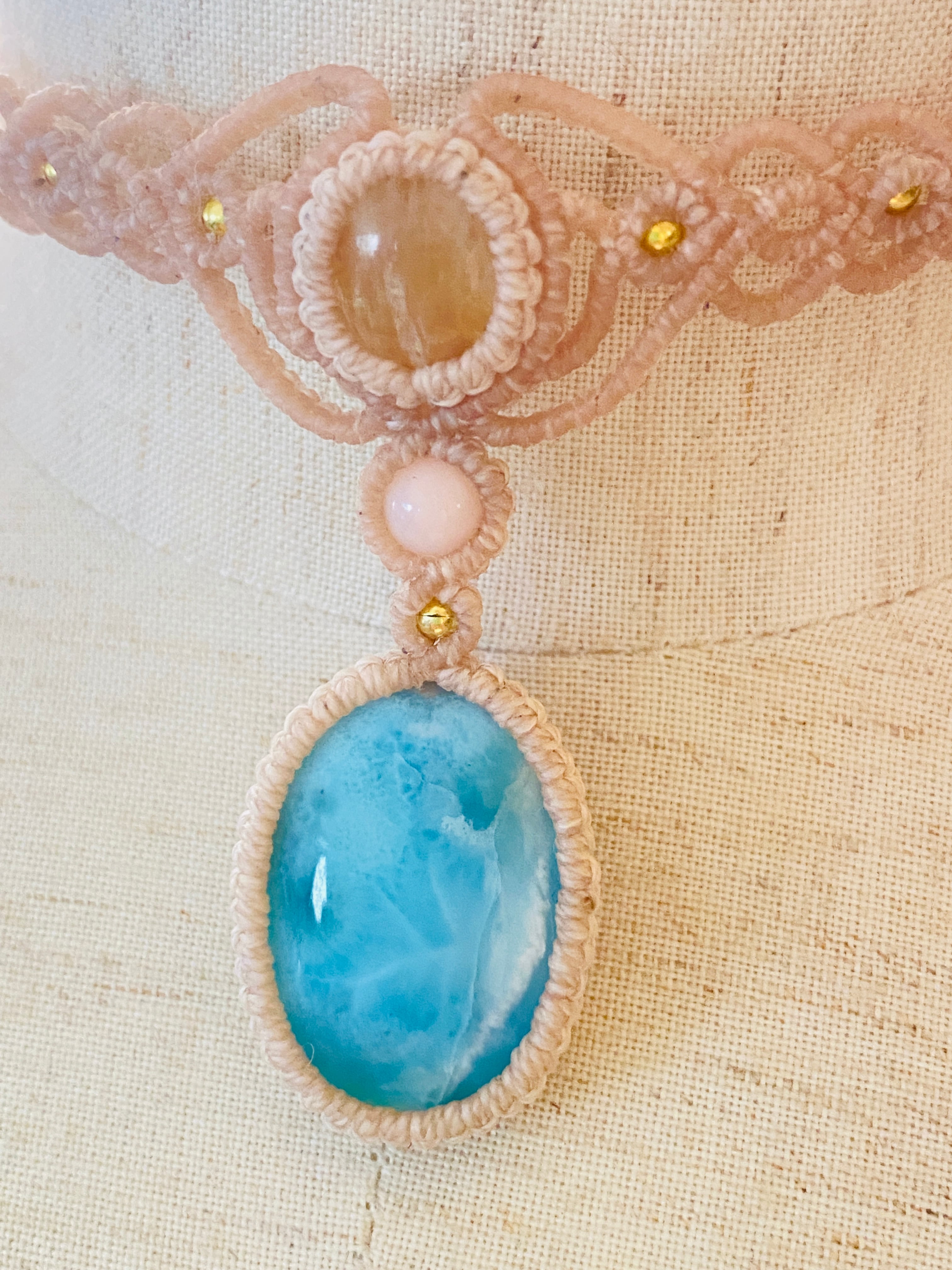 ふたつの石が寄り添うように編み上げられた、一点もののマクラメチョーカーです。